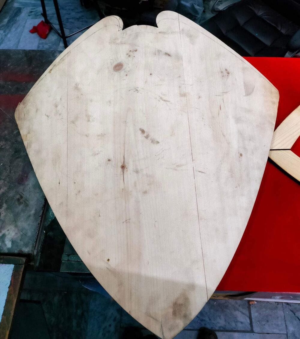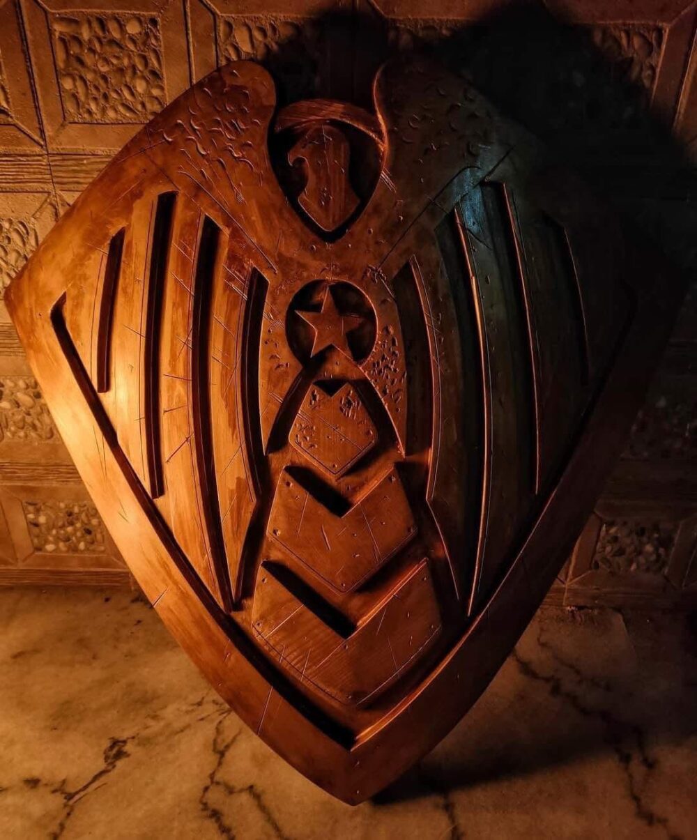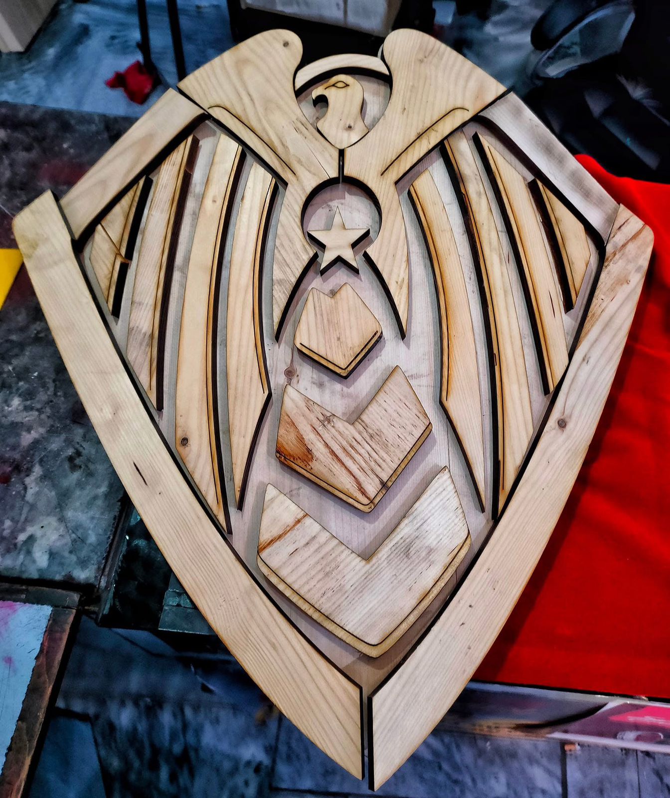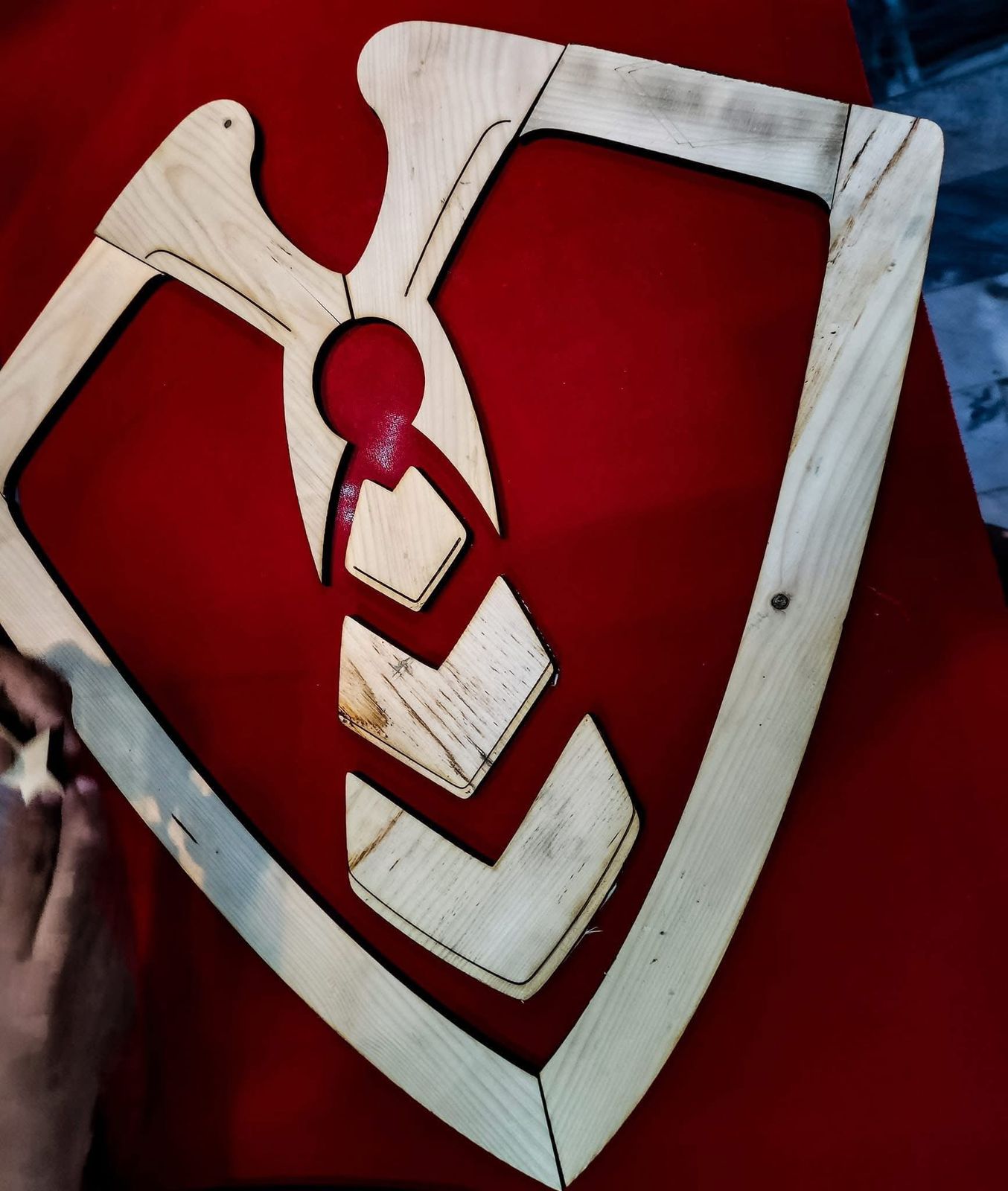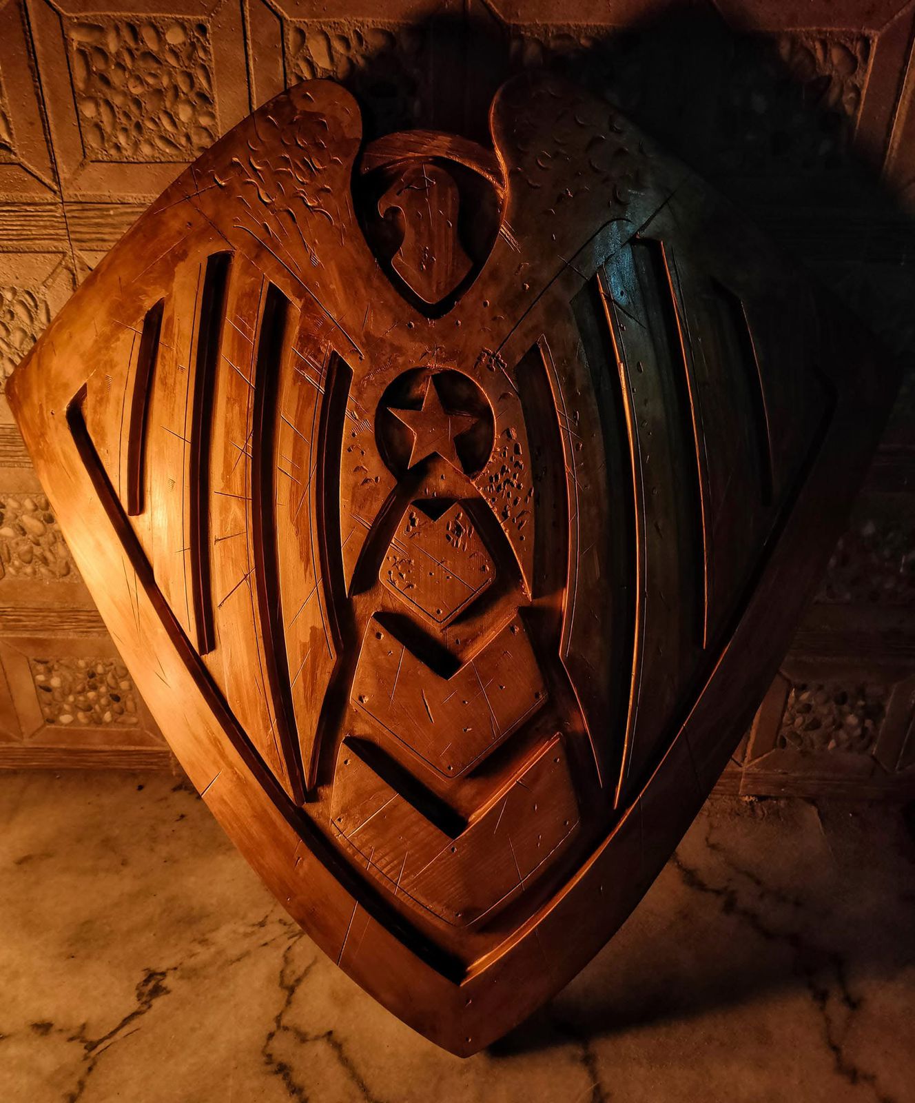 Each shield begins with a curved solid wooden base, shaped to achieve accurate depth and contour. The dimensional elements are not printed or stamped. Every individual component is crafted separately from wood, hand-shaped, refined, and carefully installed onto the base to recreate the raised structure and layered geometry seen on screen.